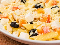 Цыплёнок гриль, сыр фета, свежие томаты, испанские маслины, сырный соус чеддар, пармезан, сыр моцарелла, пенне или спагетти из твердых сортов пшеницы (на выбор).