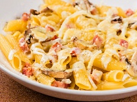 Бекон, лук репчатый, свежие шапминьоны, соус Рэнч, пармезан, сыр моцарелла, пенне или спагетти из твердых сортов пшеницы (на выбор)