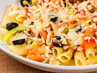 Цыплёнок Гриль, свежие томаты, испанские маслины, лук репчатый, свежие шампиньоны, сладкий перец, фирменный томатный соус, пармезан, сыр моцарелла, пенне или спагетти из твердых сортов пшеницы (на выбор).